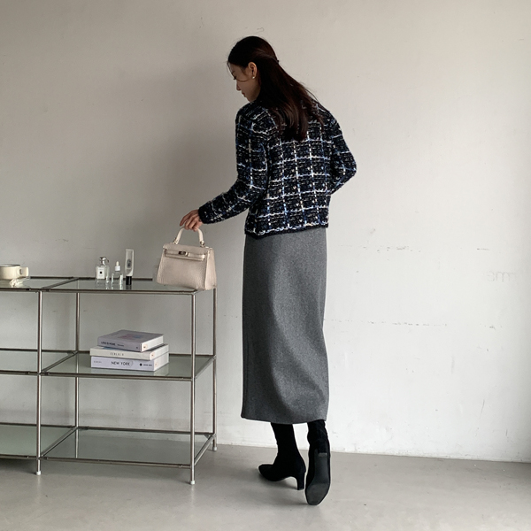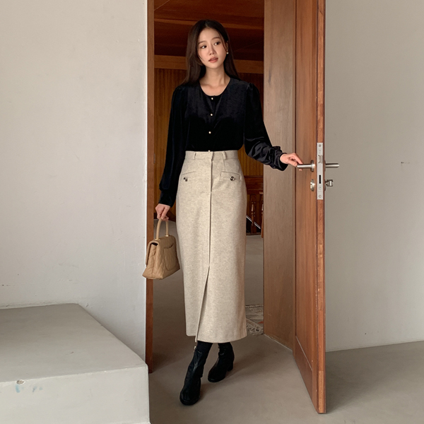 깔끔한 라인과 탄탄한 소재감의 롱 스커트에요
