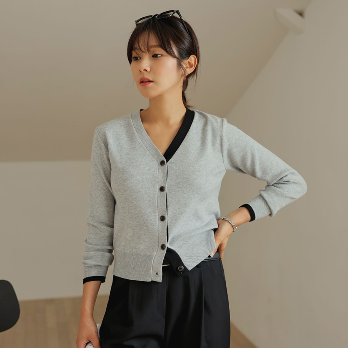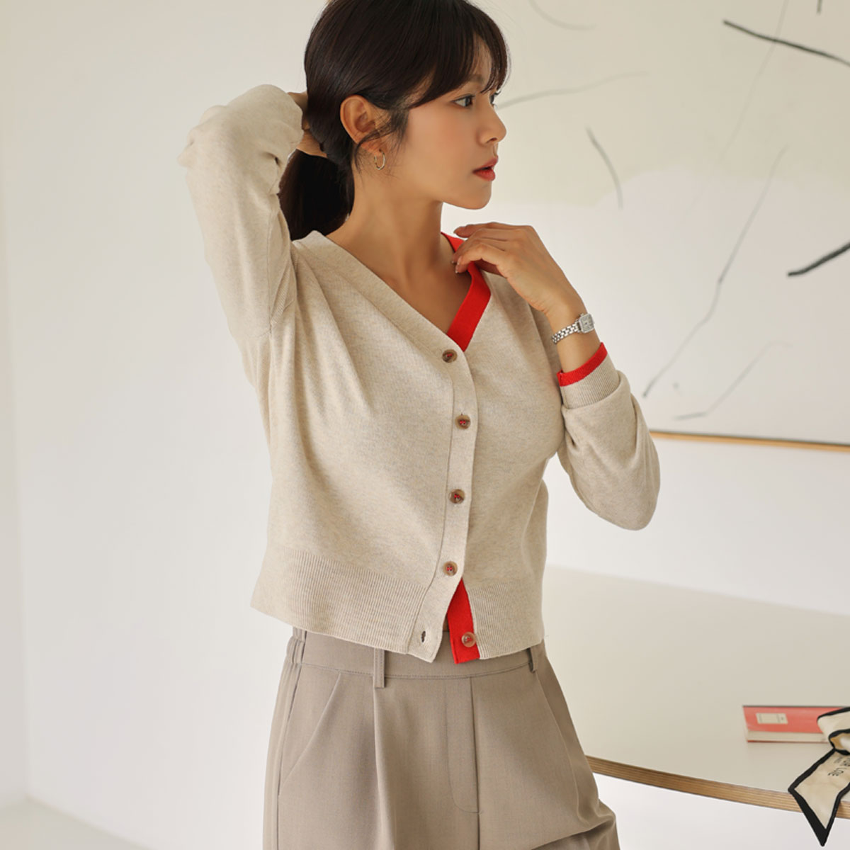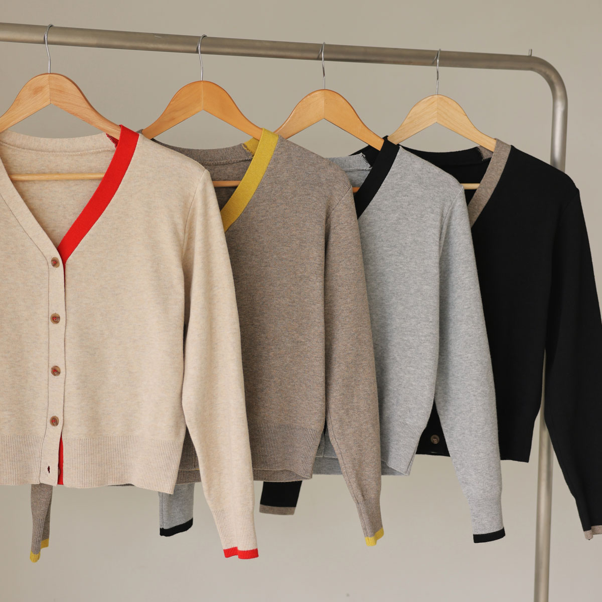 A color-block cardigan that matches well with simple outfits