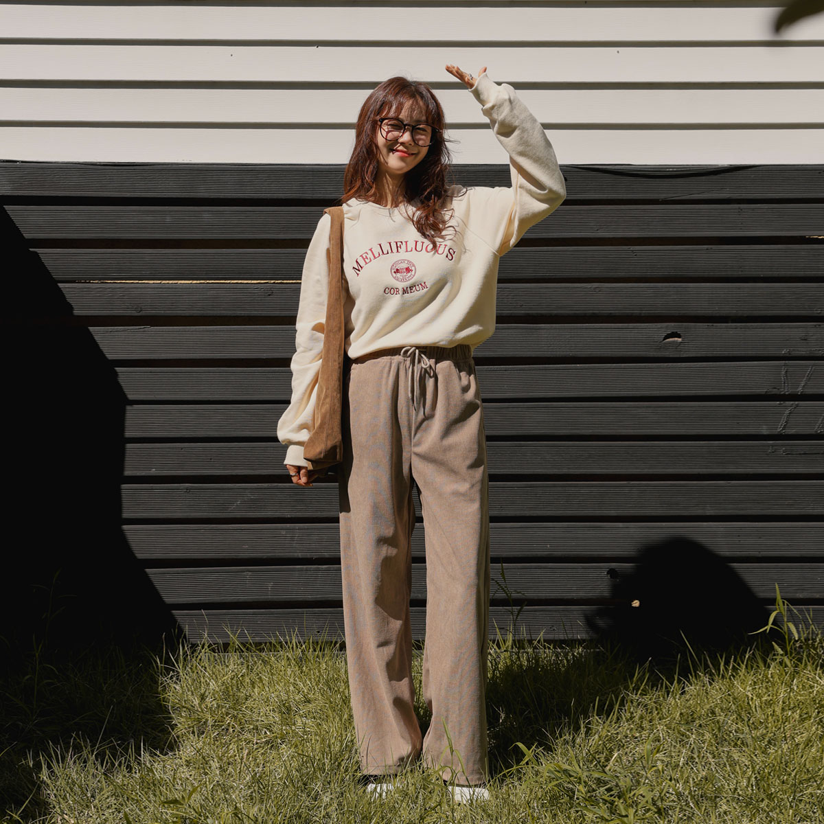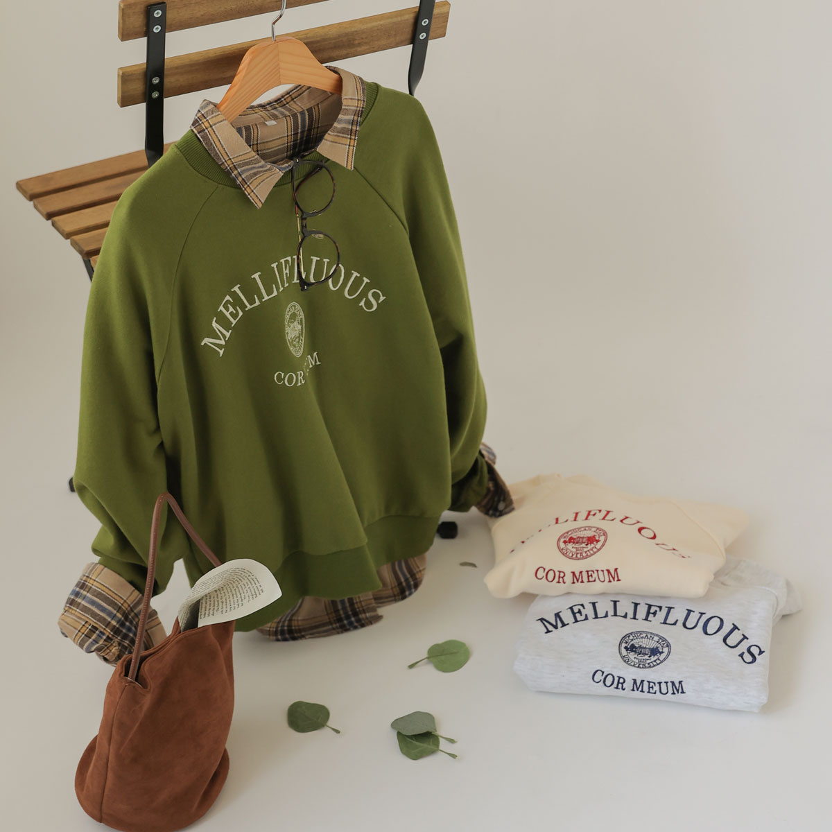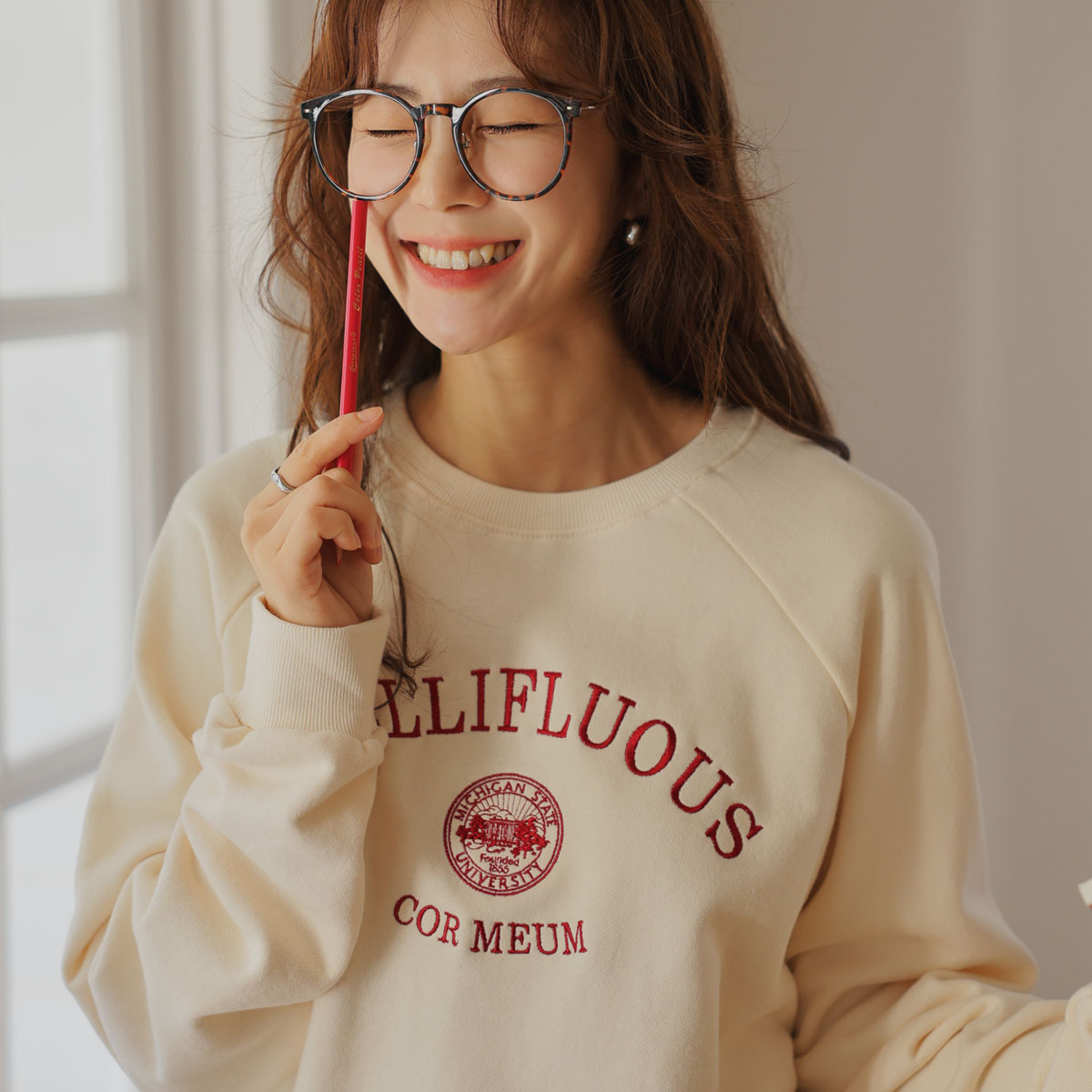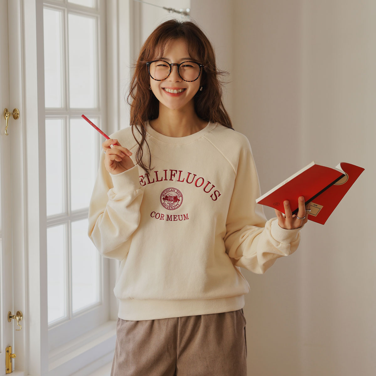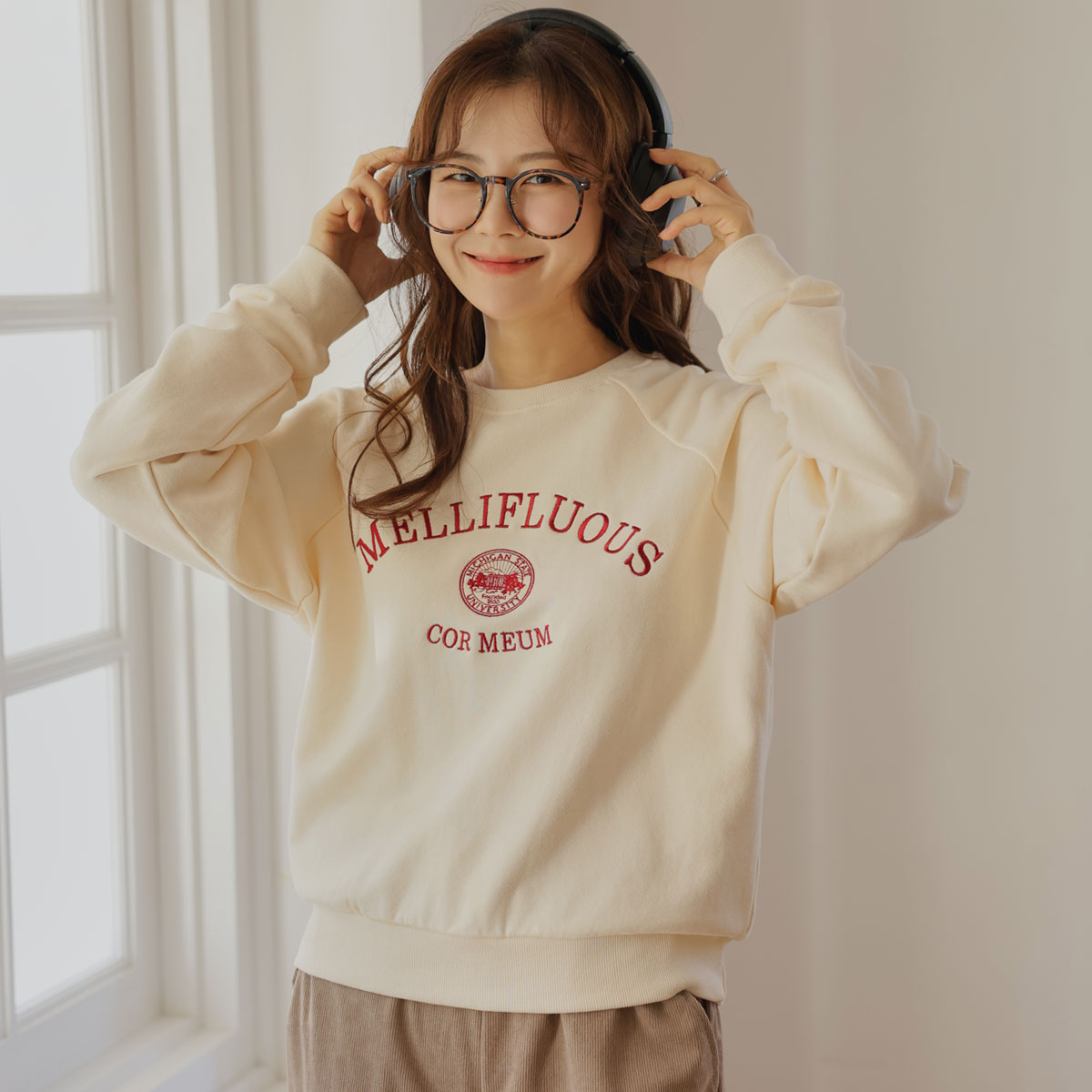 A solid, loose-fitting sweatshirt finished with embroidery accents.