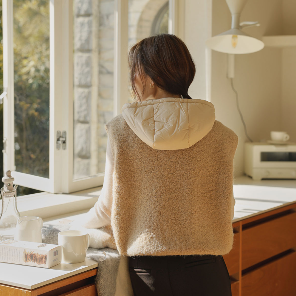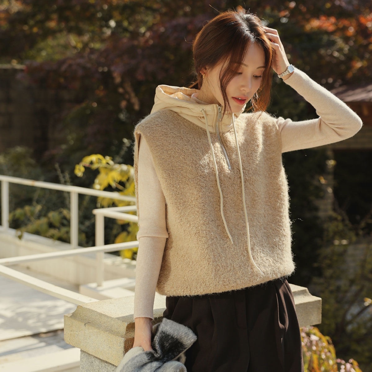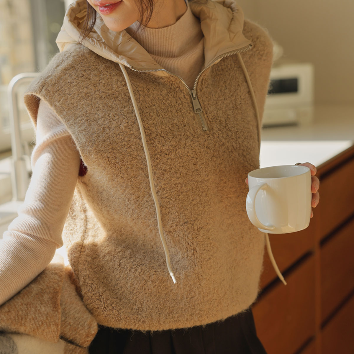 Full of warmth, Hooded semi-zip-up vest