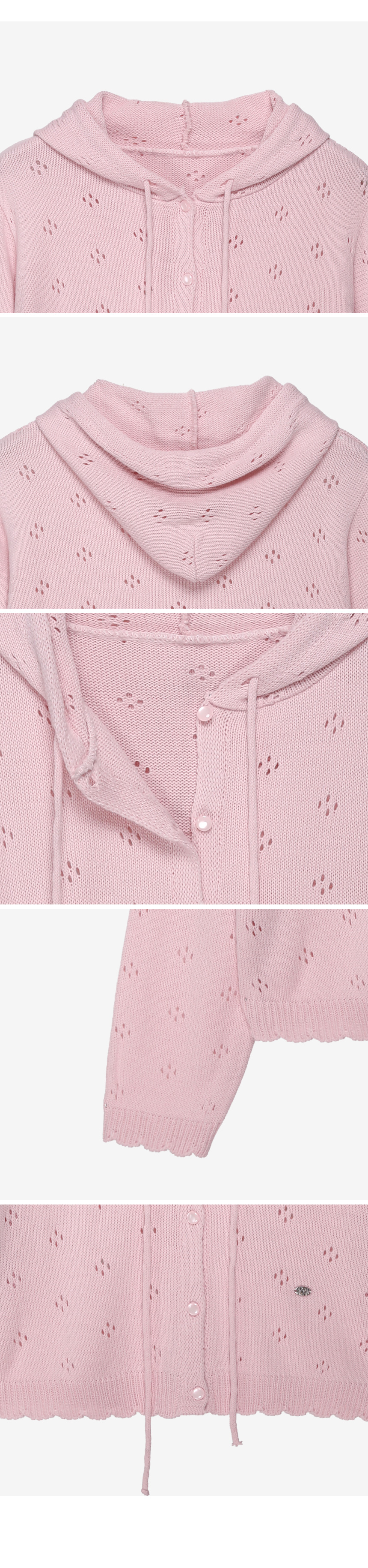 A hooded knit with a skasi texture and a pendant at the hem.